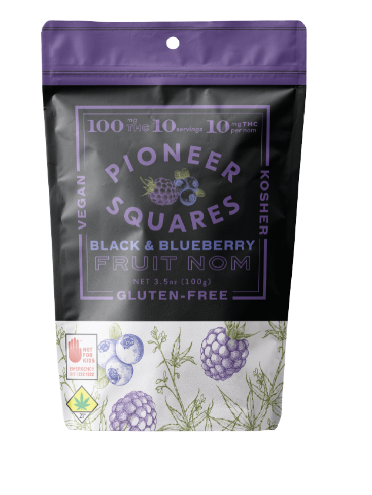 Black & Blueberry Fruit Noms are a delicious concoction from Pioneer Squares. These are the perfect balance of tart, fresh blackberries, and crisp blueberries for a delicious dose of flavor. Black & Blueberry won the Dope Cup in 2019 for Best THC edible. Each Black & Blueberry pack is 100mg of THC and 10mg per individual piece.