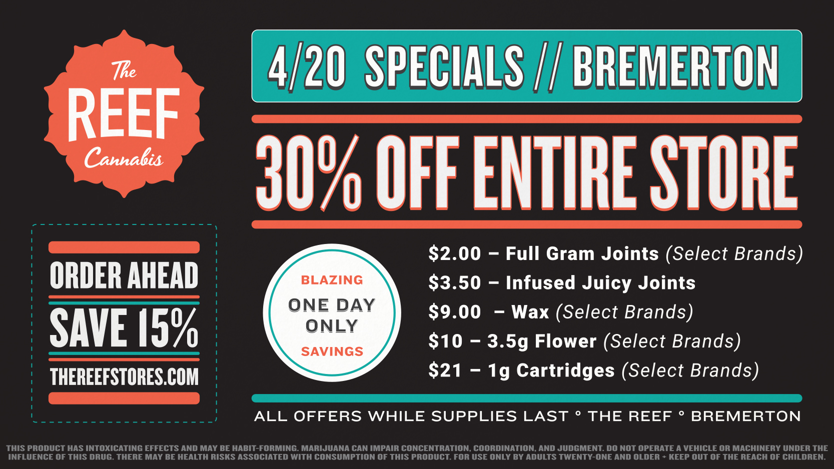 Happy 4/20 to all! The Reef Bremerton is offering 30% off the entire store TODAY ONLY. Please order ahead to limit time in the shop. We thank you in advance for your patience – we will continue limiting the number of people in the store and will enforce social distancing policies. View our online menu HERE.