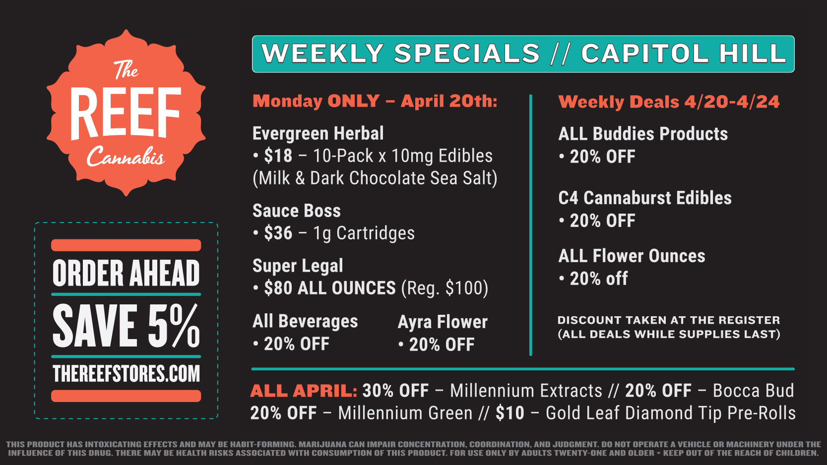 Happy 4/20 Seattle! The Reef Capitol Hill is offering a number of juicy deals throughout the month of April. Please order ahead to limit time in the shop. We thank you in advance for your patience – we will continue limiting the number of people in the store, enforcing social distancing policies, as well as our rigorous cleaning schedule. View our online menu HERE.