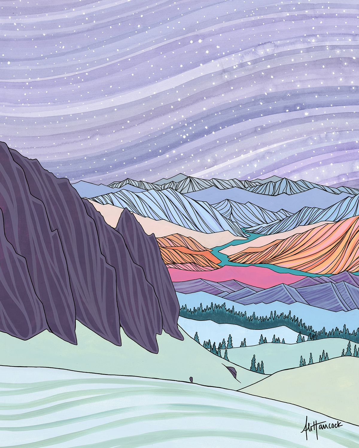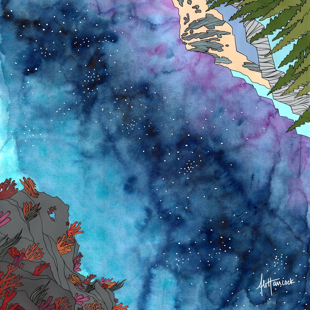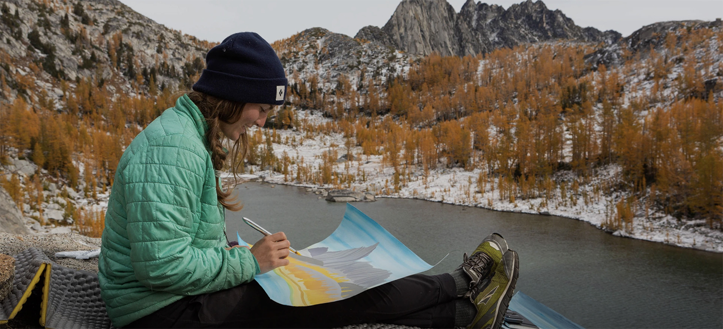 Through my artwork, I explore the relationship between humans and nature. I use watercolor, acrylic paint, and archival ink pens in a graphic and bold style to express the human experience of natural landscapes.